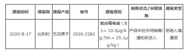 據歐盟食品和飼料快速預警系統(RASFF)消息,2020年8月17日,比利時通過RASFF通報來自土耳其的無花果干不合格。具體通報內容如下: